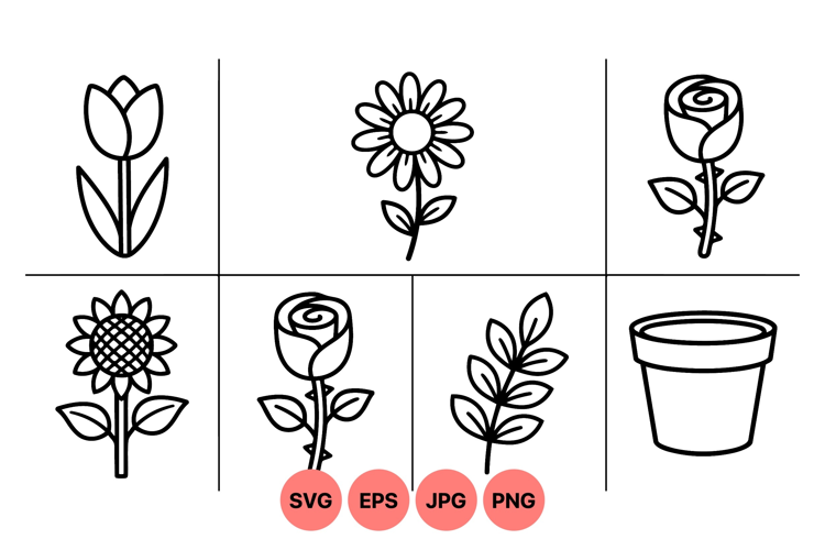 Minimalist black outline vector icons showing tulip sunflower rose blossom flower branch and flower pot for garden design and botanical projects in simple graphic style.