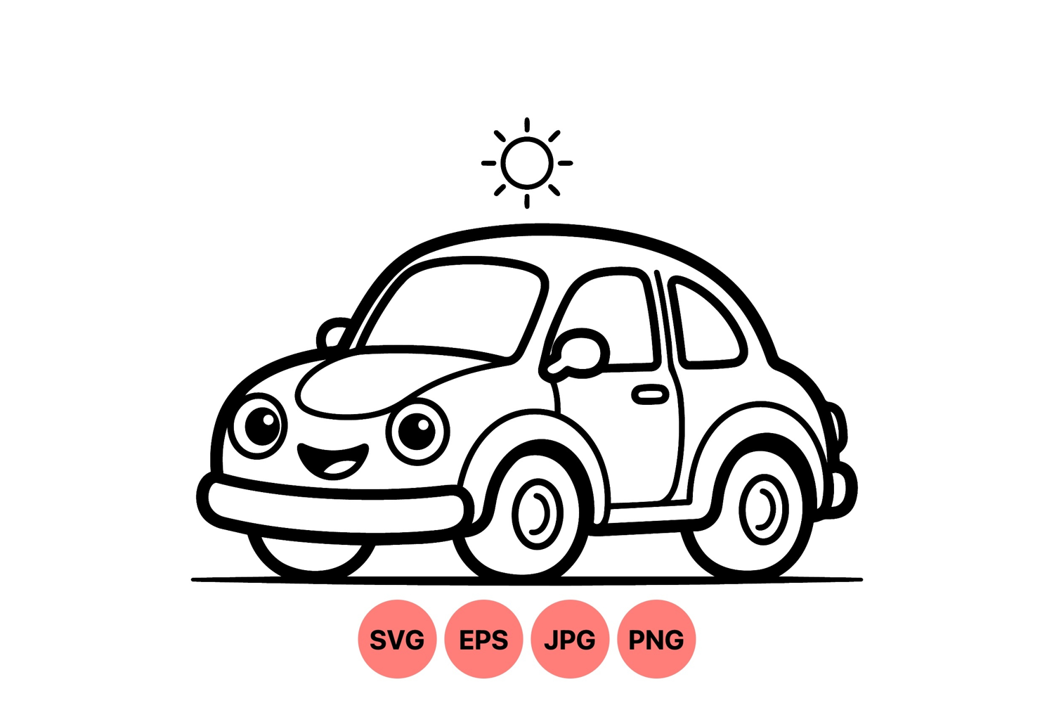 A cheerful cartoon car with big round eyes and a smiling mouth sits under a shining sun drawn in black and white vector line art style, evoking a playful and friendly mood.