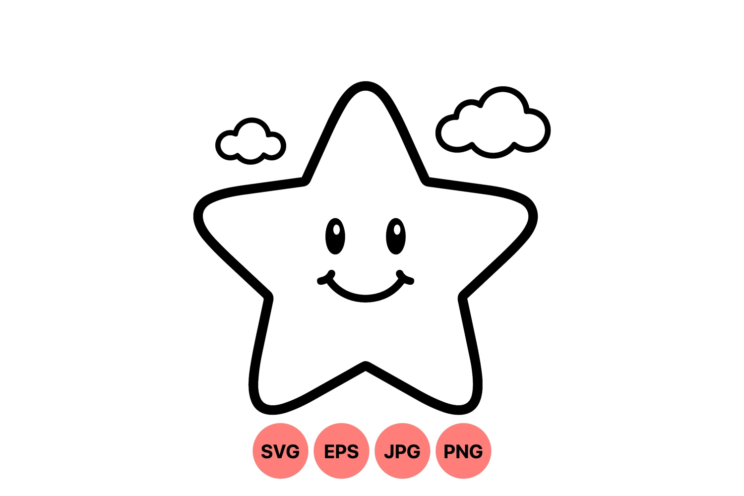 A smiling star cartoon character with two small clouds floating overhead in a simple black and white line art style for children or kid friendly designs.