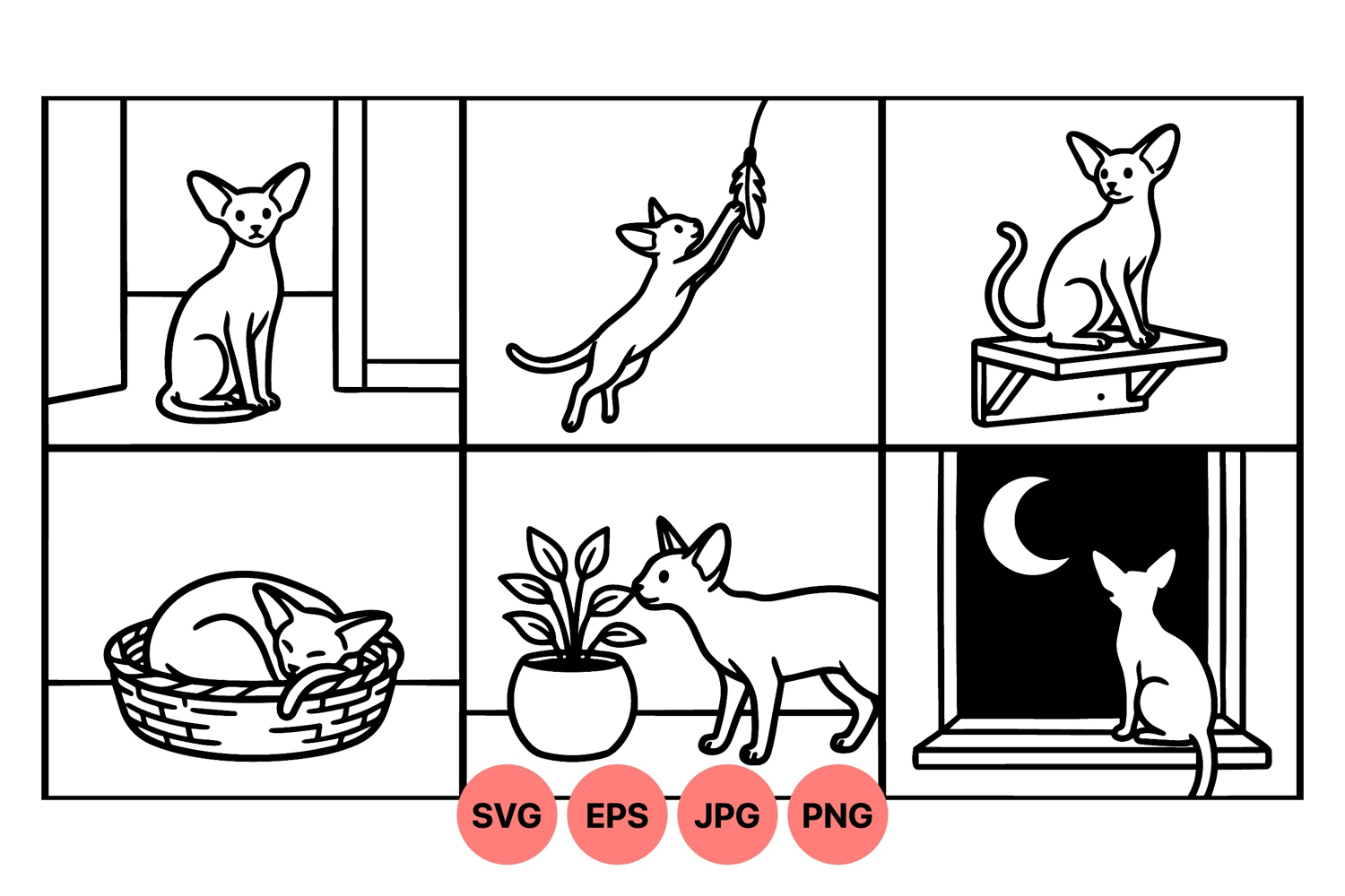 Line art vector sequence illustrating a minimalist slender cat in various poses including sitting, playing with a feather, resting in a basket, and looking out a window at night, simple black on white style, calm and playful mood