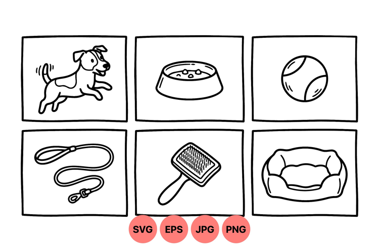Playful Dog Clipart Pet Grooming Clipart Dog Care Illustration Hand Drawn Leash Dog Toy Graphics Animal Pet Vectors Puppy Care Design Dog Bowl Drawing Pet Bed Artwork Dog Brush Vector