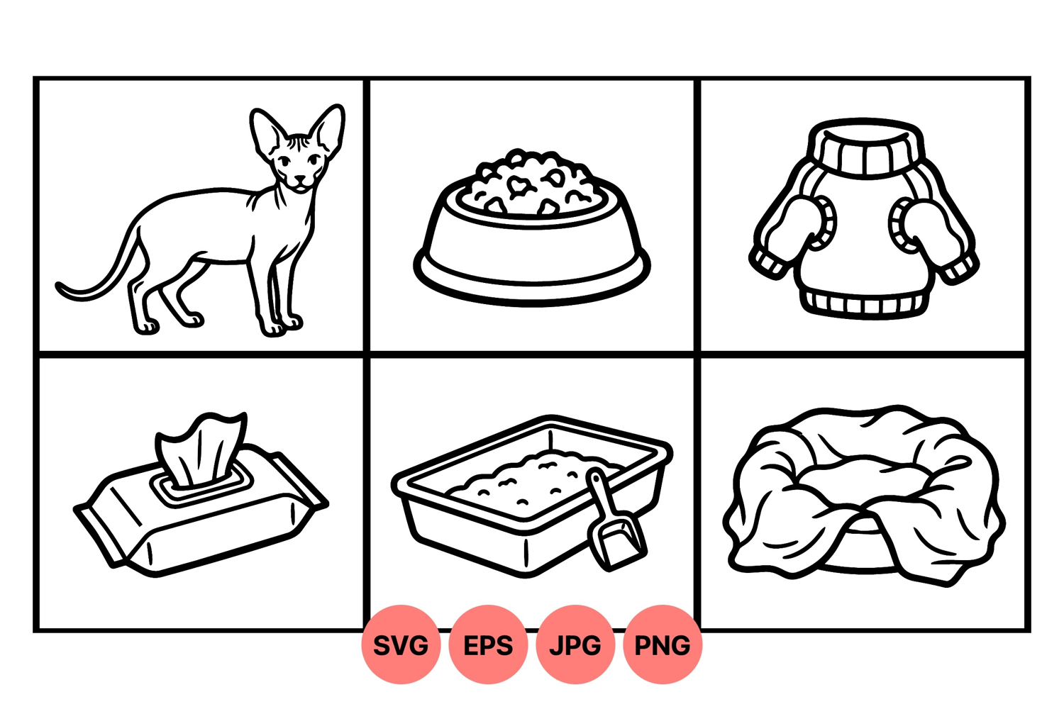 A black and white vector featuring a hairless cat illustration with essential pet items including a sweater, litter box, tissue , food bowl, and cozy soft bed for cats.