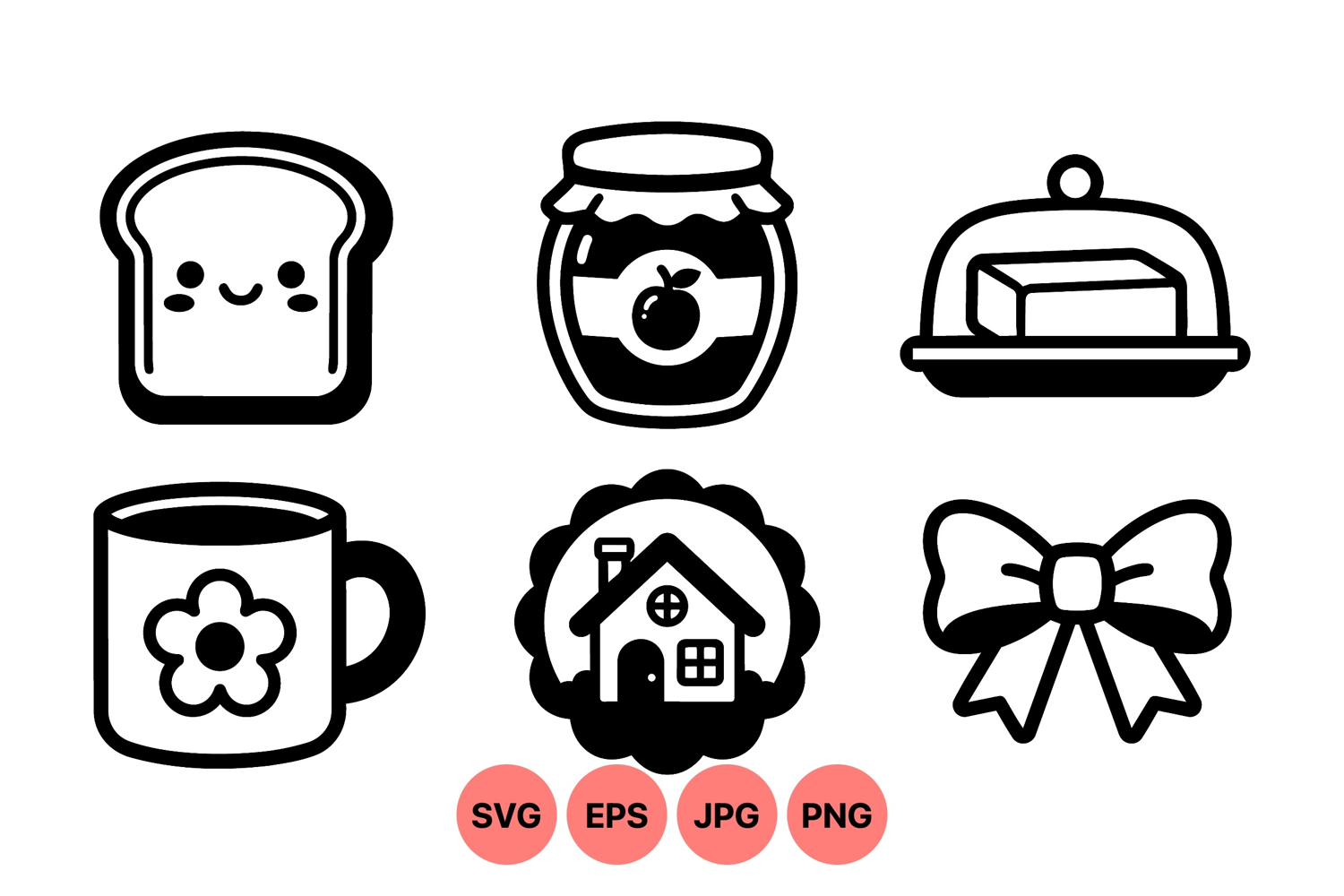 A kawaii style black and white vector includes cute bread with face jar of jam butter mug with flower house emblem and a decorative bow in simple bold lines