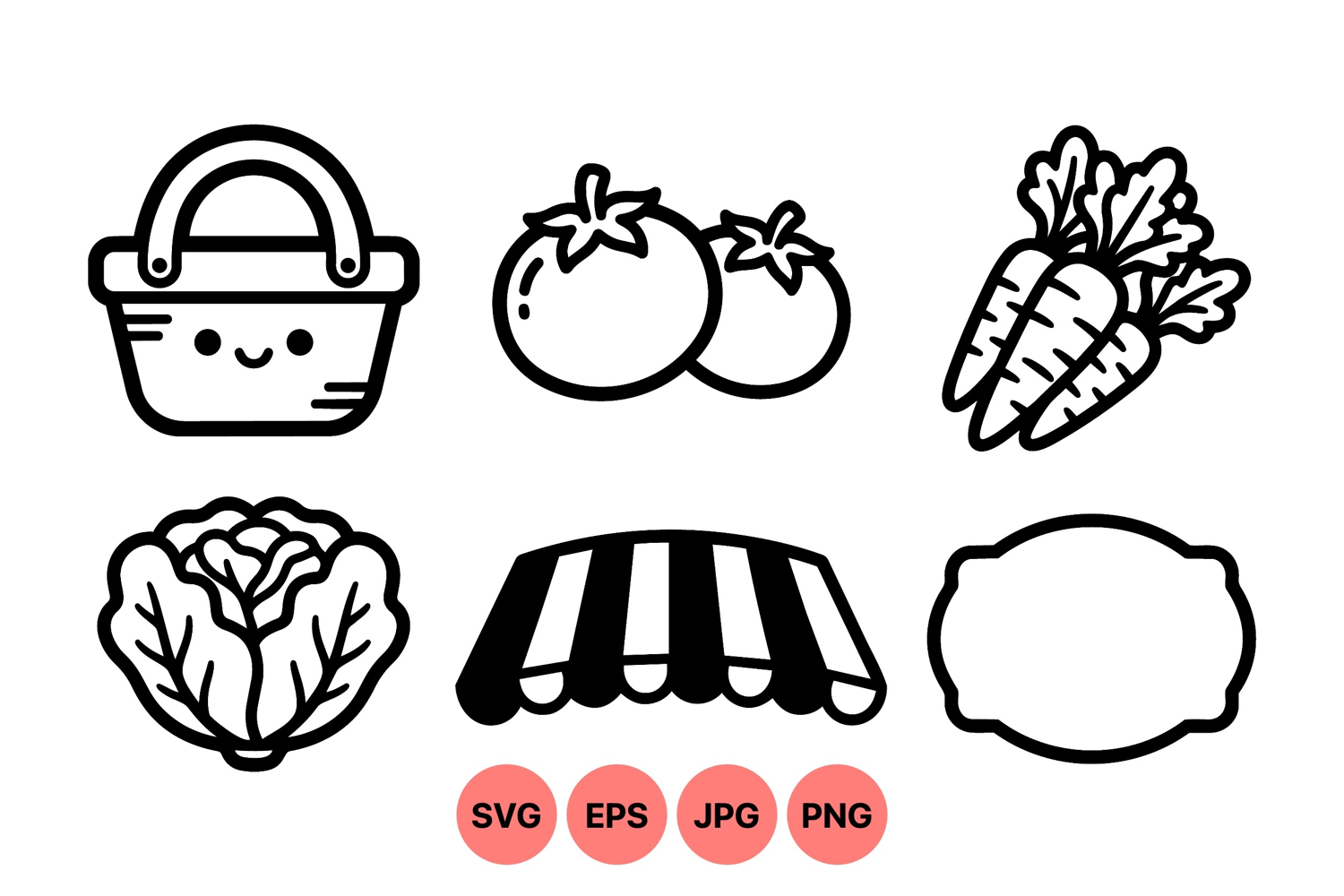 of simple black and white vector icons including smiling shopping basket, fresh tomatoes, carrots, leafy lettuce, store awning, and blank label in minimalist style.