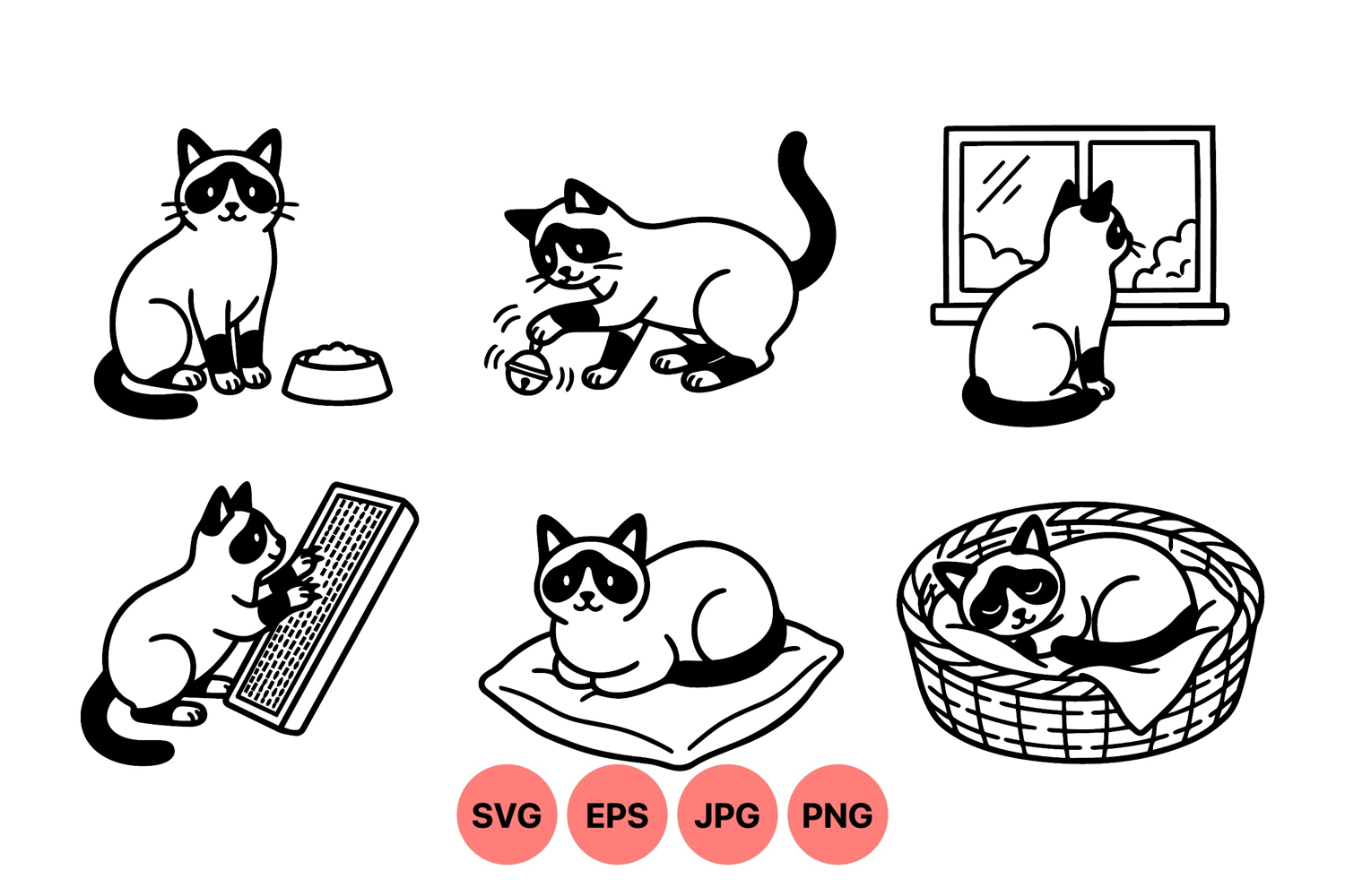 Vector art shows siamese cat in various poses including playing with bell typing on keyboard sitting on cushion and sleeping in basket near window creating calm and playful mood.