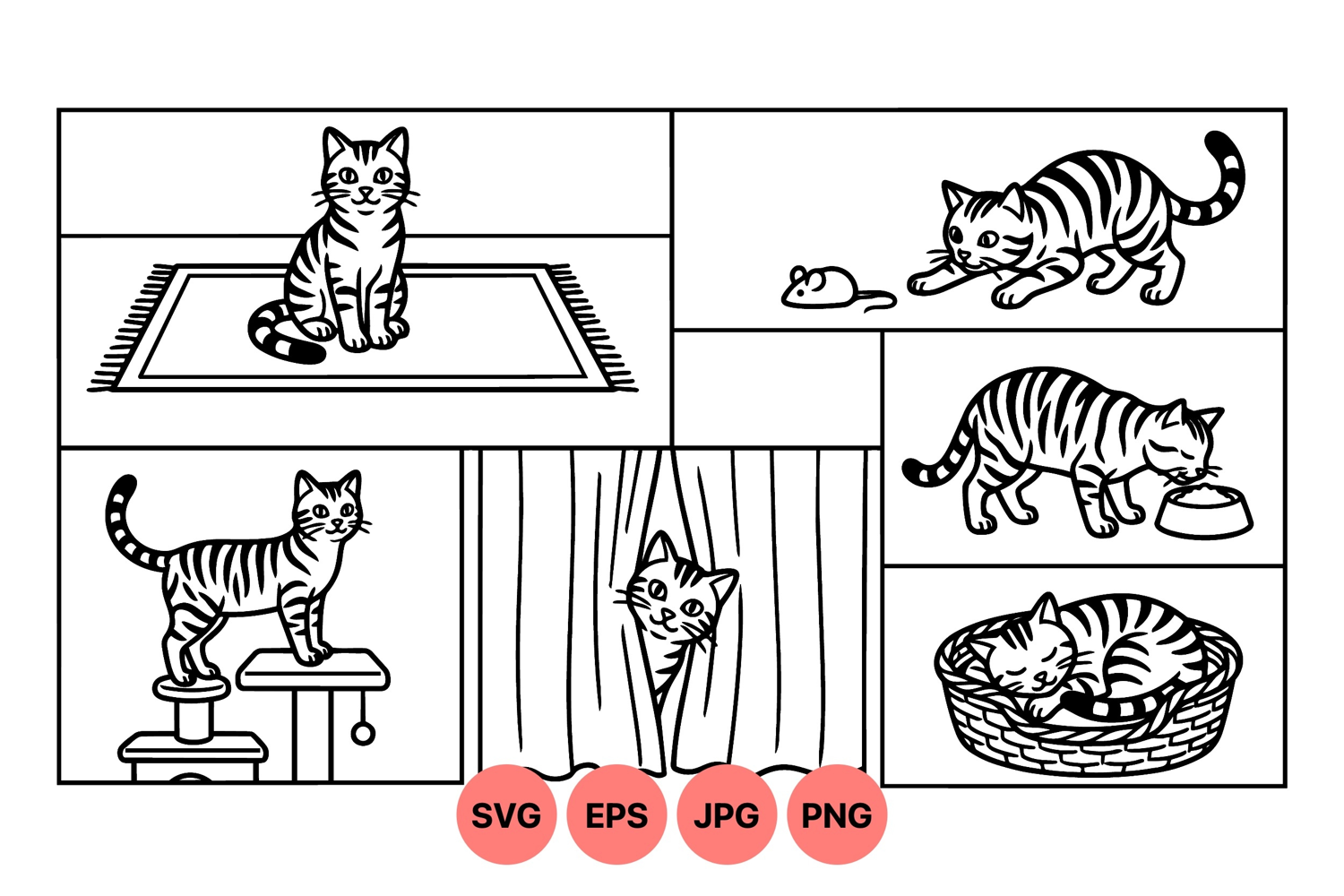 A of tabby cats engaged in various indoor activities including sitting on a rug playing with a toy mouse hiding behind curtains eating from a bowl and sleeping in a basket rendered in detailed black and white line art style suitable for pet themed designs and editorial content