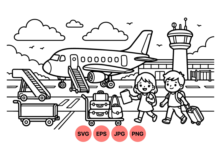 A cheerful boy and girl carrying backpacks and pulling suitcases walk on tarmac near an airplane with boarding stairs and airport control tower visible in the background in a clean line art style.