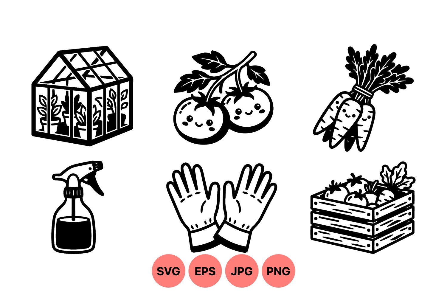 Black and white vector icons showing smiling tomatoes carrots garden gloves spray bottle greenhouse and wooden crate in minimalist flat design style with cheerful mood
