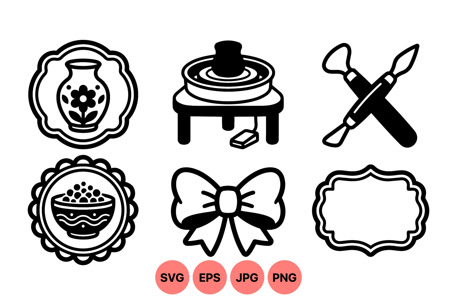 Bow Ribbon Clipart Decorative Frame Design Handmade Craft Icons Clay Bowl Illustration Vintage Craft Icons Pottery Wheel Graphic Sculpting Tool Vector Circle Plate Image Artistic Craft Design Classic Art Graphics