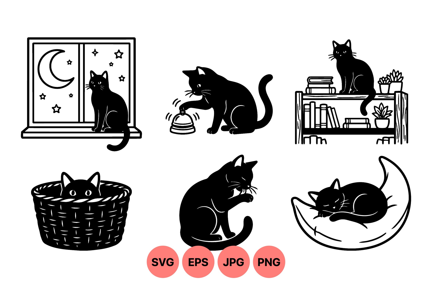 Playful of black cat vectors showing various poses including sitting on window, playing, grooming, resting on crescent moon pillow, and hiding in basket, simple black and white style.