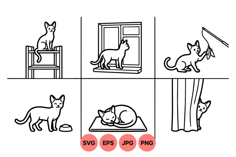 Clean black line drawing showing multiple cats sitting on chair and window sill playing with toy eating and sleeping on mat in minimalist style with peaceful mood
