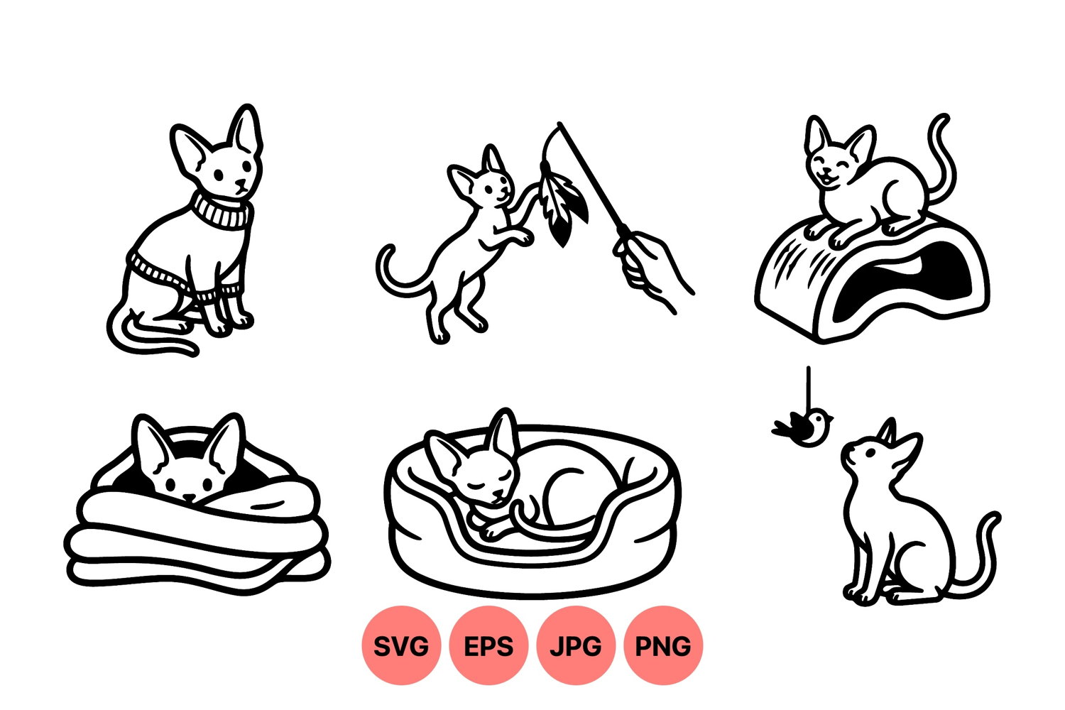 A of simple black and white minimalist cat vector art featuring six small cats in various poses including playing with a feather toy sleeping and sitting with cozy beds peaceful and charming mood