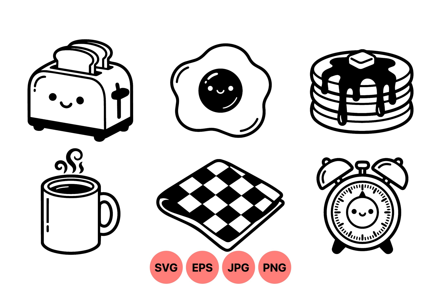 A of cute kawaii style breakfast icons including a smiling toaster with bread, fried egg, pancakes with syrup and butter, steaming coffee cup, checkered napkin, and happy alarm clock face.