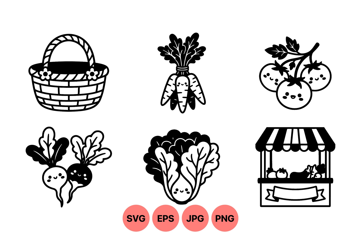 Playful black and white vector illustrations showcase happy vegetables including carrots tomatoes radishes lettuce with basket and market stall icons in a whimsical style.