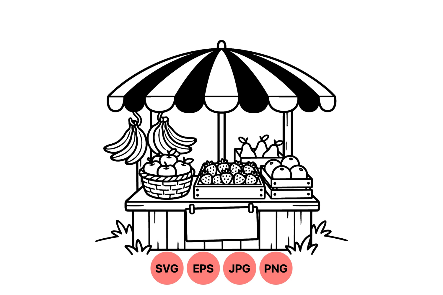 A black and white line drawing of a fruit market stand showing bananas apples strawberries pears and oranges under a striped canopy in a simple minimal style peaceful.