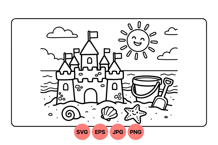 A cheerful sun shines over a detailed sandcastle featuring flags alongside a bucket and shovel on the sandy beach scattered with shells and starfish in line art style.