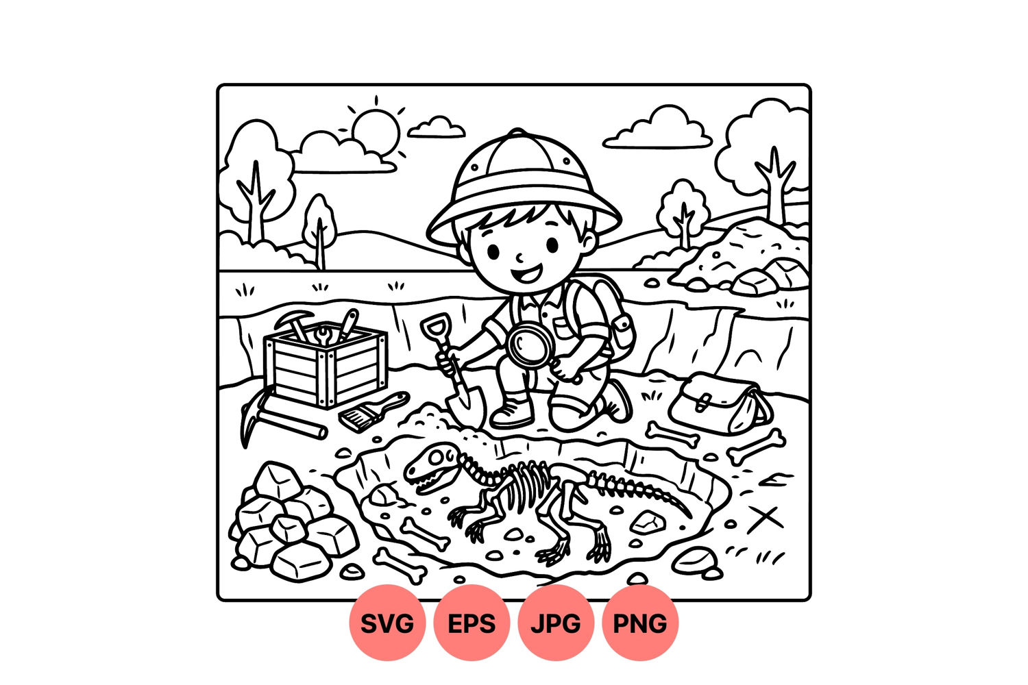 Educational Dinosaur Art Dinosaur Excavation Clipart Kids Adventure Design Prehistoric Fossil Illustration Child Explorer Graphic Archaeology Dig Drawing Paleontology Clipart Design Digging Site Line Art Kids Science Illustration Fossil Discovery Graphic