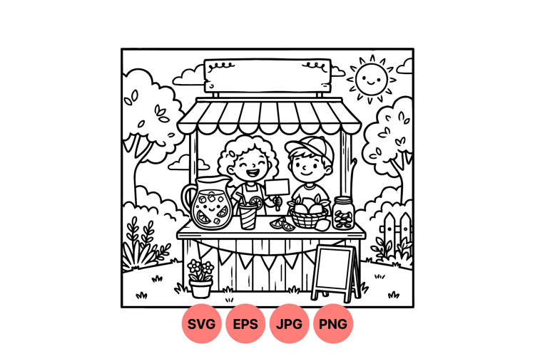 Smiling children run a lemonade stand outdoors with fruit basket and jar of coins under a bright sun surrounded by trees and flowers in a cheerful line art style