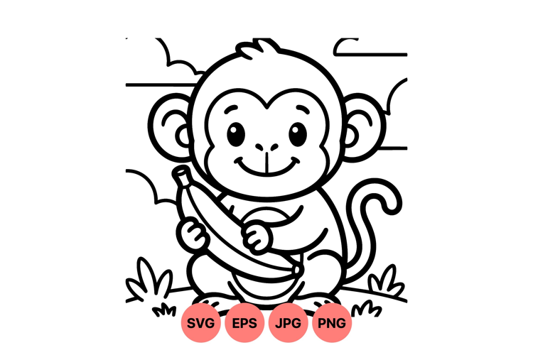 A charming black and white line art vector showing a happy cartoon monkey sitting outdoors holding a big banana surrounded by grass and clouds creating a playful mood