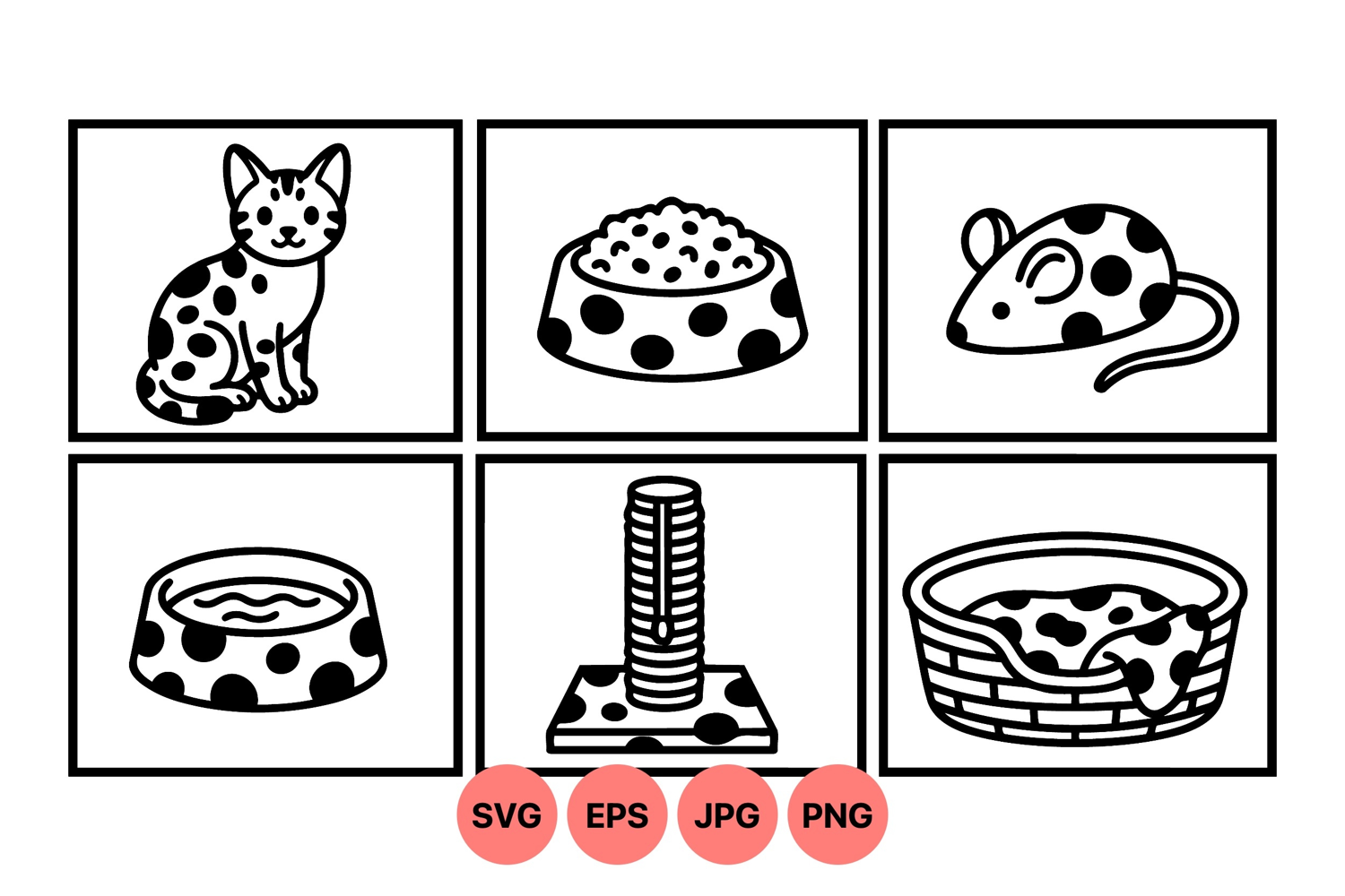 Simple black and white cartoon vector icons showing a cat sitting alongside a polka dot food bowl full and empty, a scratching post, toy mouse, and a polka dot patterned pet bed