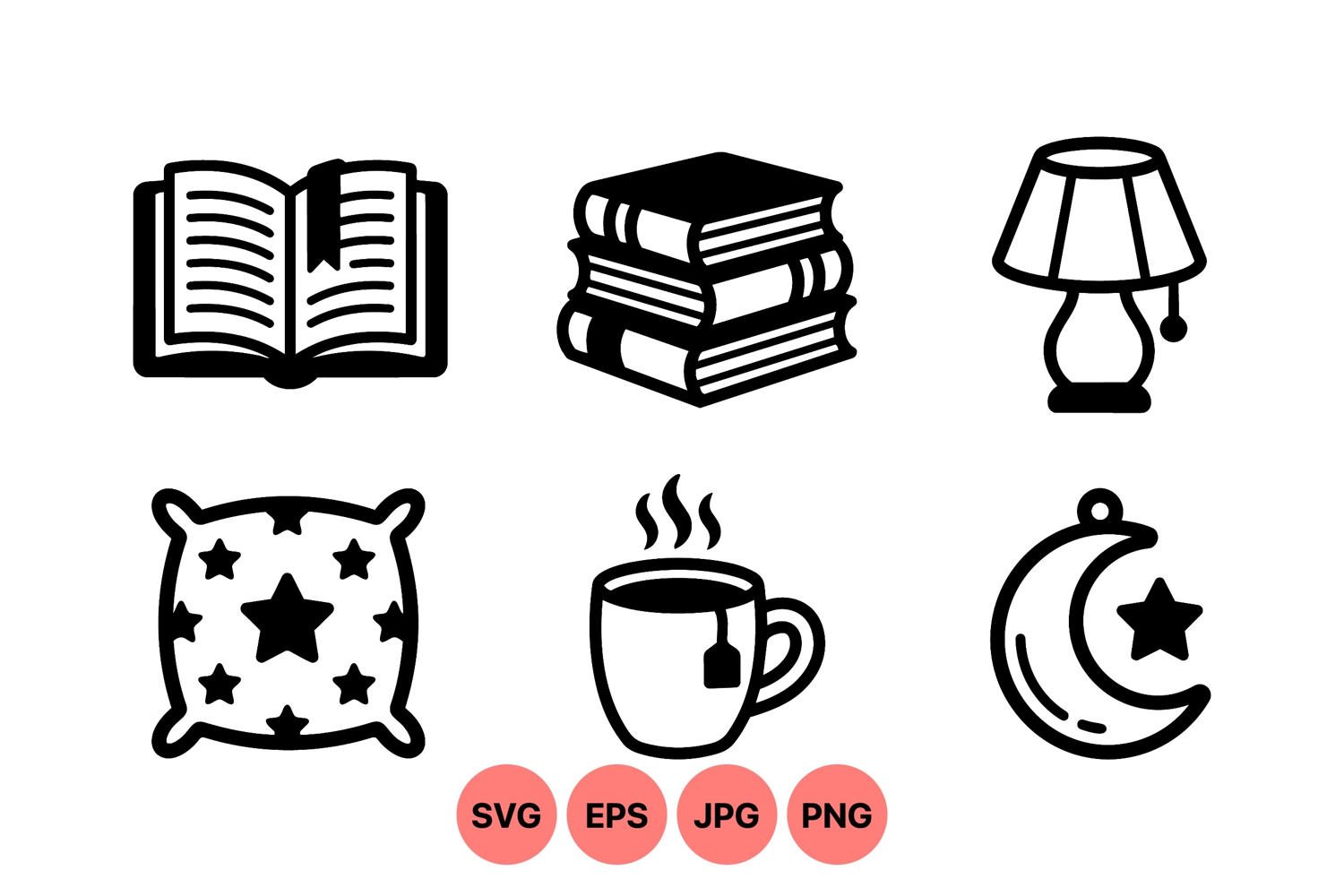 Simple black and white vector icons including an open book with bookmark, stacked books, lamp, star decorated pillow, steaming tea cup, and crescent moon with star symbol for various uses in digital and print design.