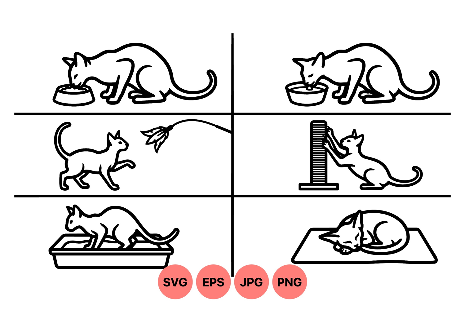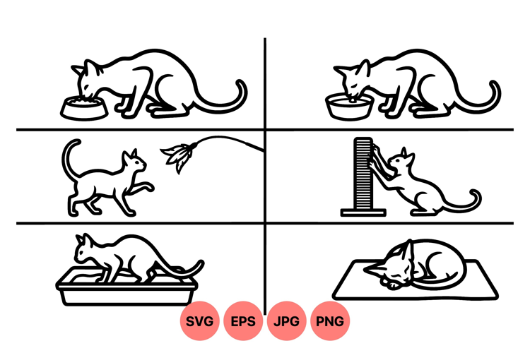 Simple black line art vector shows a cat eating food drinking water playing with a toy scratching a post using litter box and sleeping peacefully on a mat