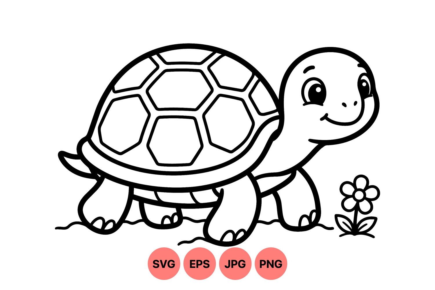 A charming black and white line art vector of a happy turtle walking beside a small flower showing playful nature and innocence in a simple and friendly style