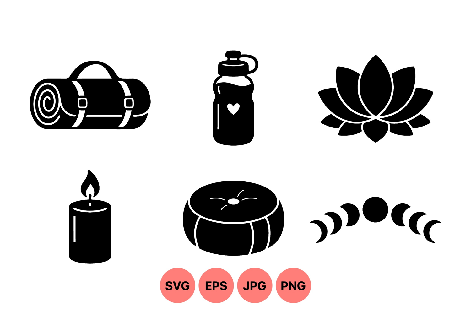 Black minimalist icons represent yoga and meditation essentials such as a rolled mat, water bottle with heart, lotus flower, candle, cushion, and moon phases for wellness themes.