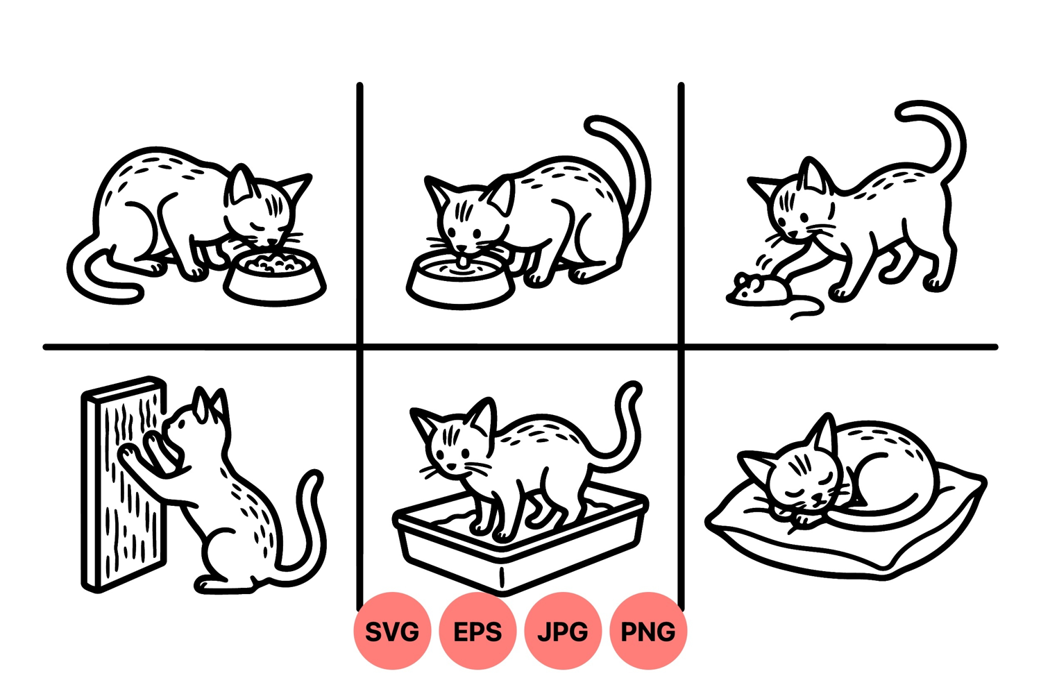 Line Art Cat Cat Litter Box Cute Cat Drawing Pet Animal Clipart Cat Scratching Post Sleeping Cat Illustration Kitten Eating Food Cat Drinking Water Cat Playing Mouse Cat Resting Pillow
