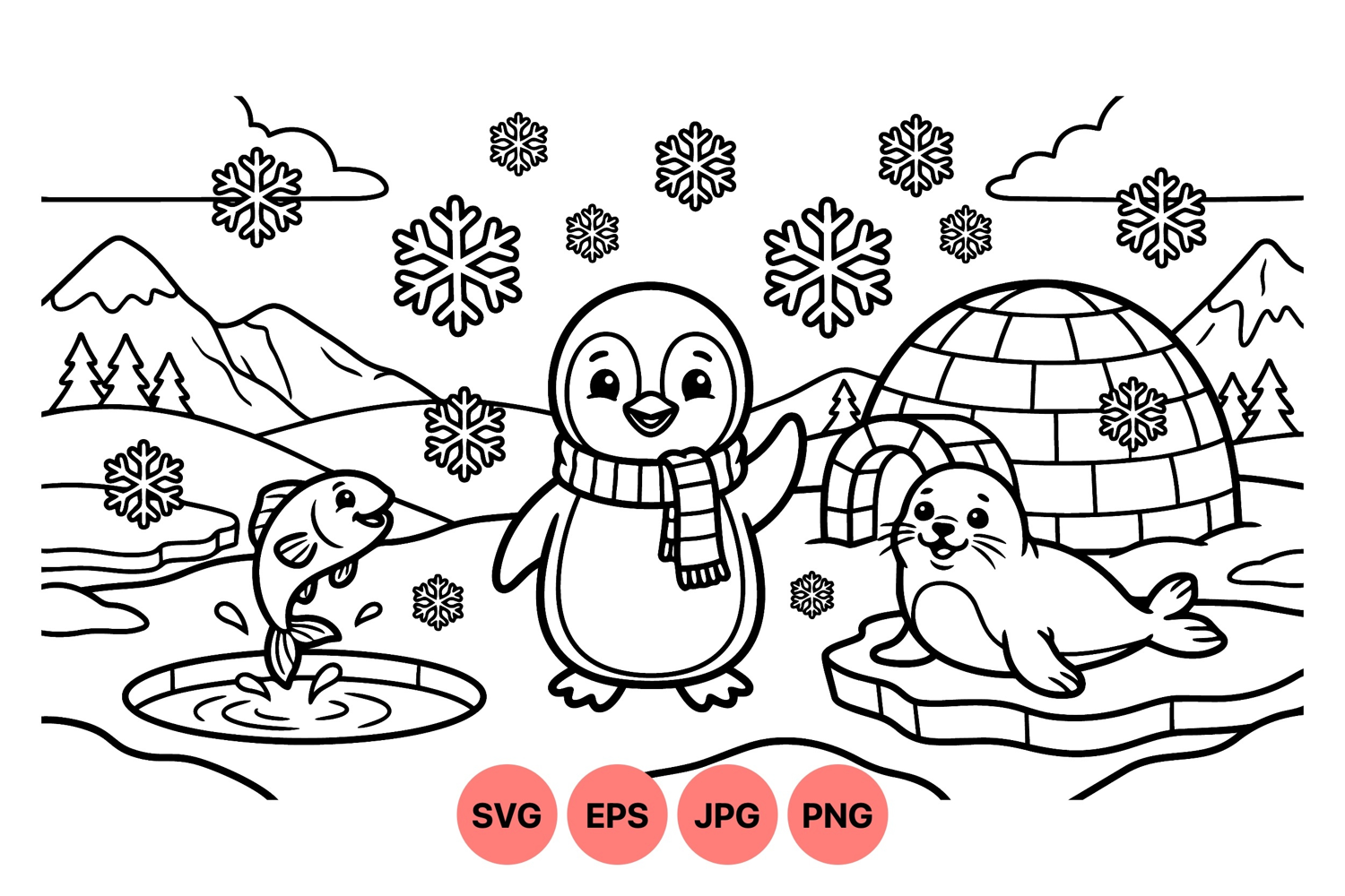 A charming black and white line drawing shows a smiling penguin in a scarf waving next to a relaxed seal on ice with a fish jumping and an igloo in snowy landscape, cheerful mood