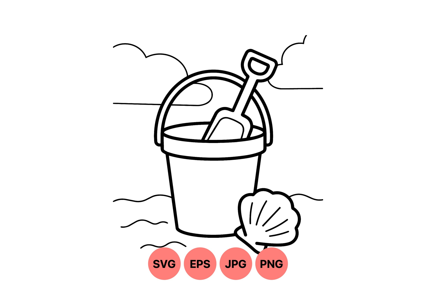 Simple black and white vector line art shows a beach bucket with handle and shovel inside accompanied by a seashell on wavy sand with clouds in background offering a playful summer vibe