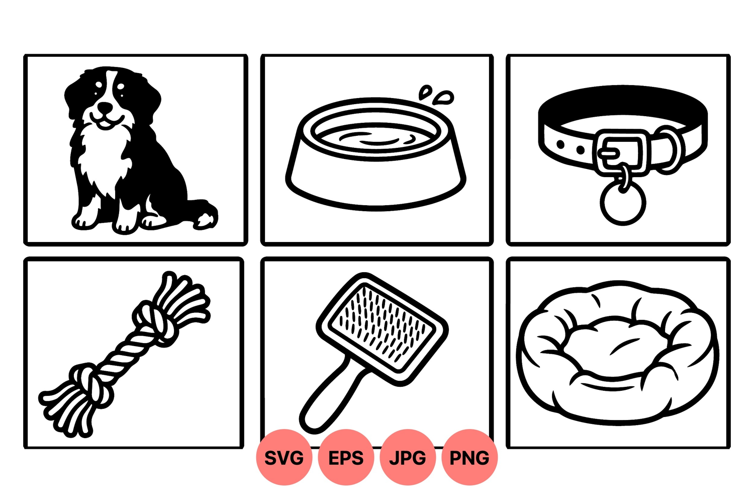 Dog Bed Clipart Dog Care Illustrations Line Art Dog Images Pet Grooming Designs Puppy Accessory Clipart Dog Toy Drawing Dog Feeding Bowl Pet Brush Graphic Canine Collar Artwork Cute Dog Outline