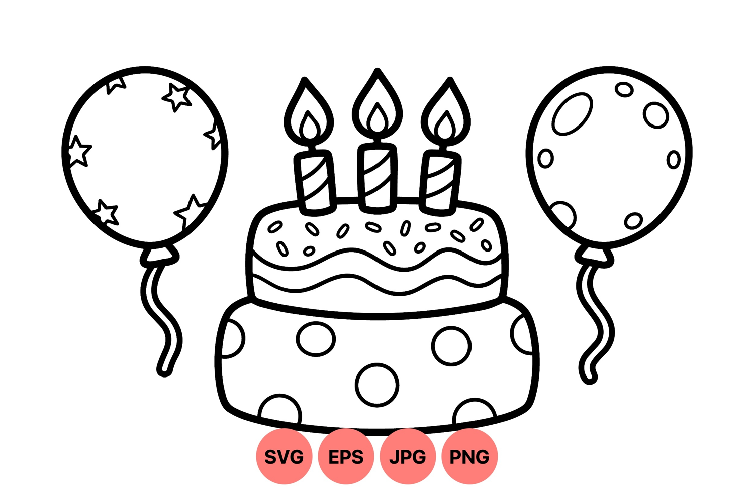 Simple black line drawing shows a two tier birthday cake with three lit candles and two decorated balloons floating around it in a festive style digital vector art suitable for children party designs happy mood