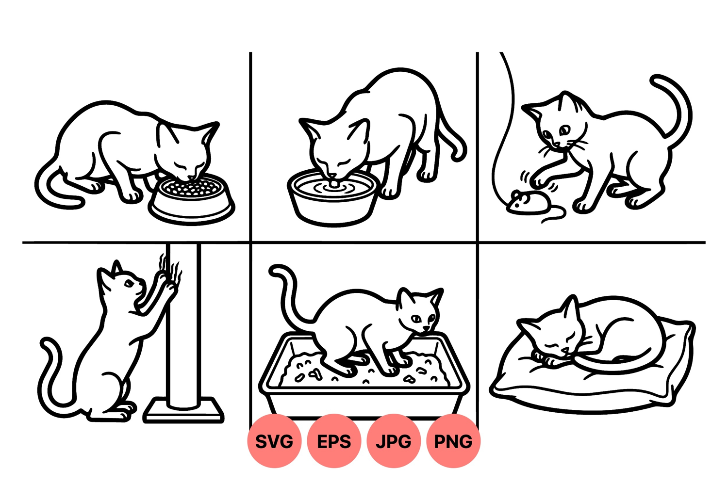 Cat Litter Box Scratching Post Design Vector Cat Outline Cat Playing Toy Cat Feeding Illustration Pet Drinking Water Cat Sleeping Icon Animal Care Illustration Kitten Activity Lineart Feline Daily Routine