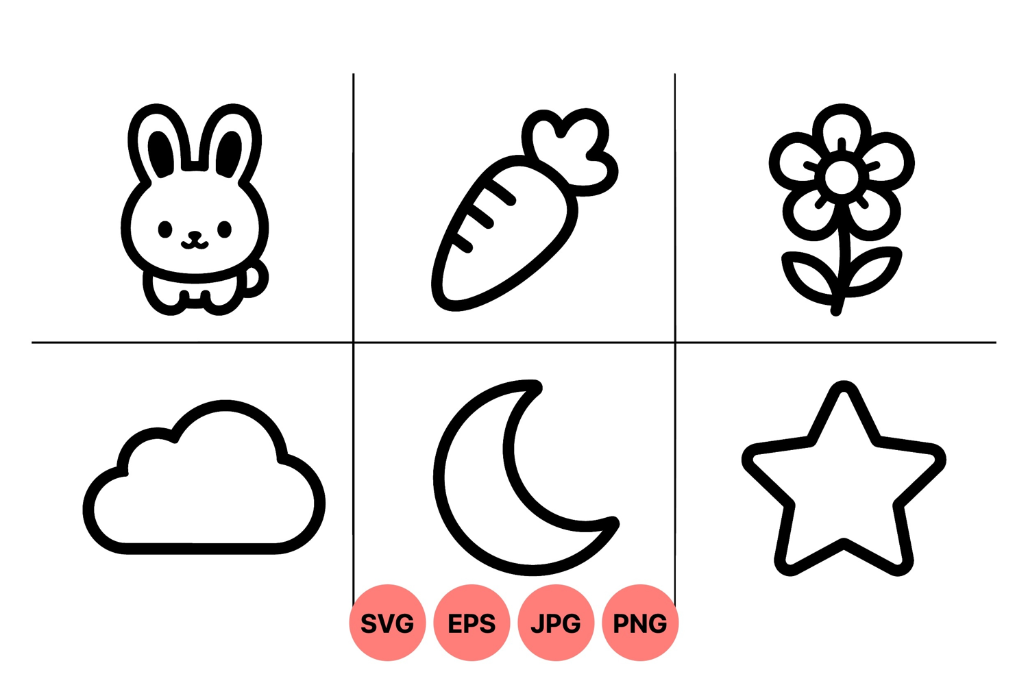 of six simple black line art vector icons including bunny, carrot, flower, cloud, moon, and star in cartoon style with clean minimal design and playful mood.
