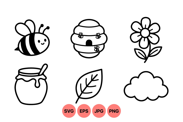 Honey Jar Clipart Bee Hive Illustration Cloud Shape Design Flower Outline Art Cute Bee Graphic Nature Icon Design Leaf Vector Graphic Friendly Cartoon Icons Playful Nature Elements