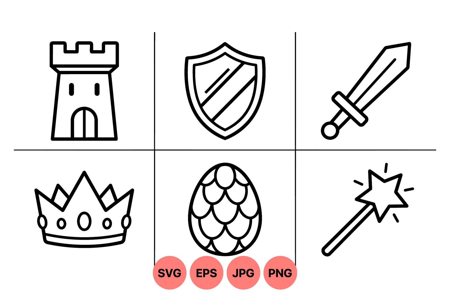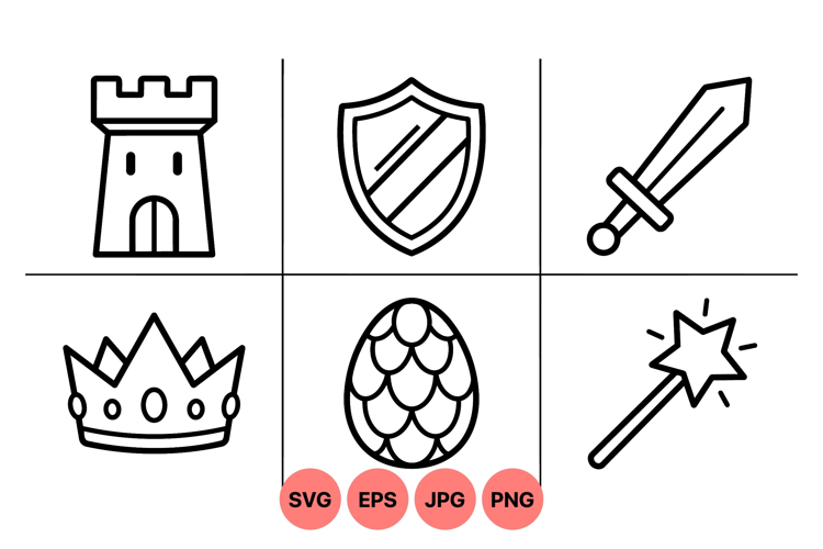 A of simple black line art vector icons featuring a castle tower shield sword crown dragon egg and magical wand in minimalist style clear design perfect for fantasy themes