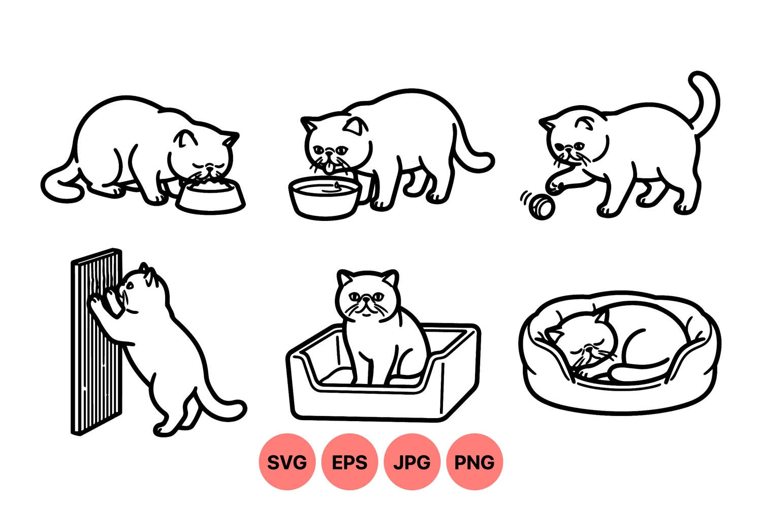 Line art vector showcases cats eating from bowls drinking water playing with ball scratching post sitting in bed and sleeping peacefully in pet accessories .