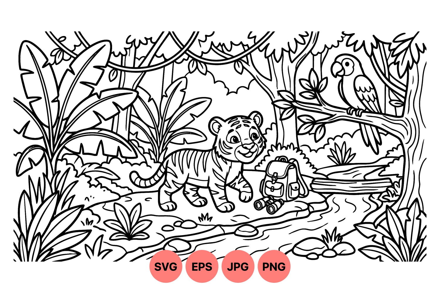 Jungle Animal Clipart Black And White Drawing Children Coloring Page Cute Tiger Vector Wildlife Cartoon Design Explorer Adventure Art Forest Scene Illustration Tropical Nature Graphics Animal Kids Vector Adventure Gear Drawing