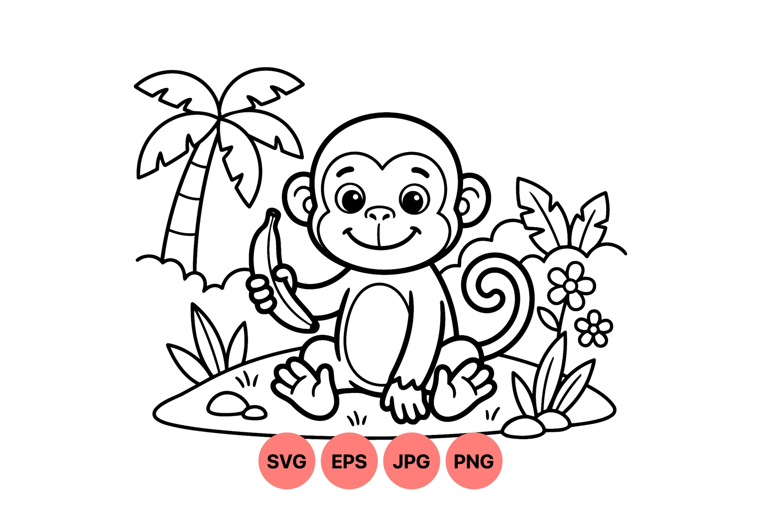 Kids Coloring Svg Tropical Animal Design Cute Cartoon Monkey Monkey Line Art Jungle Theme Clipart Banana Fruit Illustration Playful Animal Graphic Vector Kids Design Palm Tree Drawing Fun Children Art