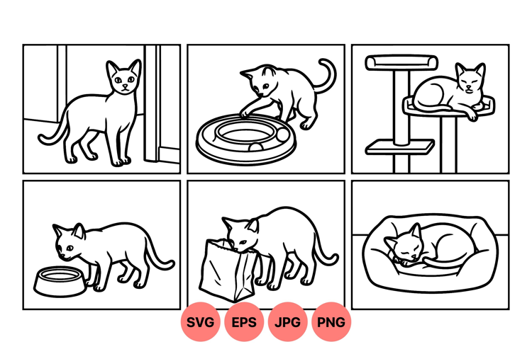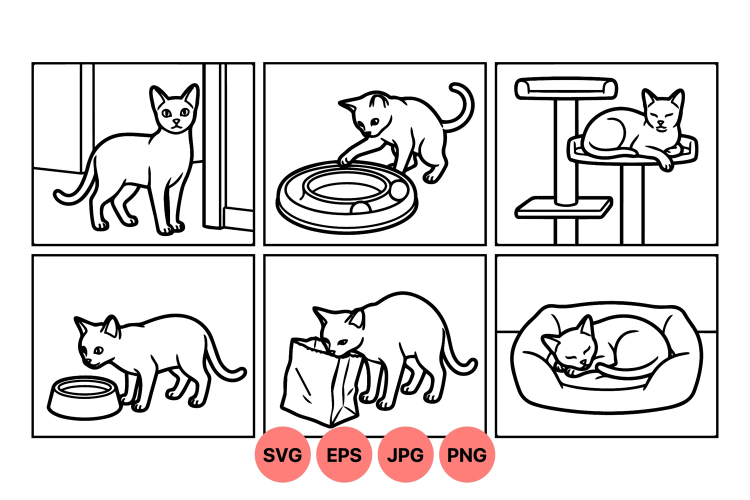 A monochrome vector artwork depicts a cat in six scenes showing various actions including playing with a ball toy, resting in a pet bed, exploring a paper bag, and eating from a bowl in a calm indoor setting.