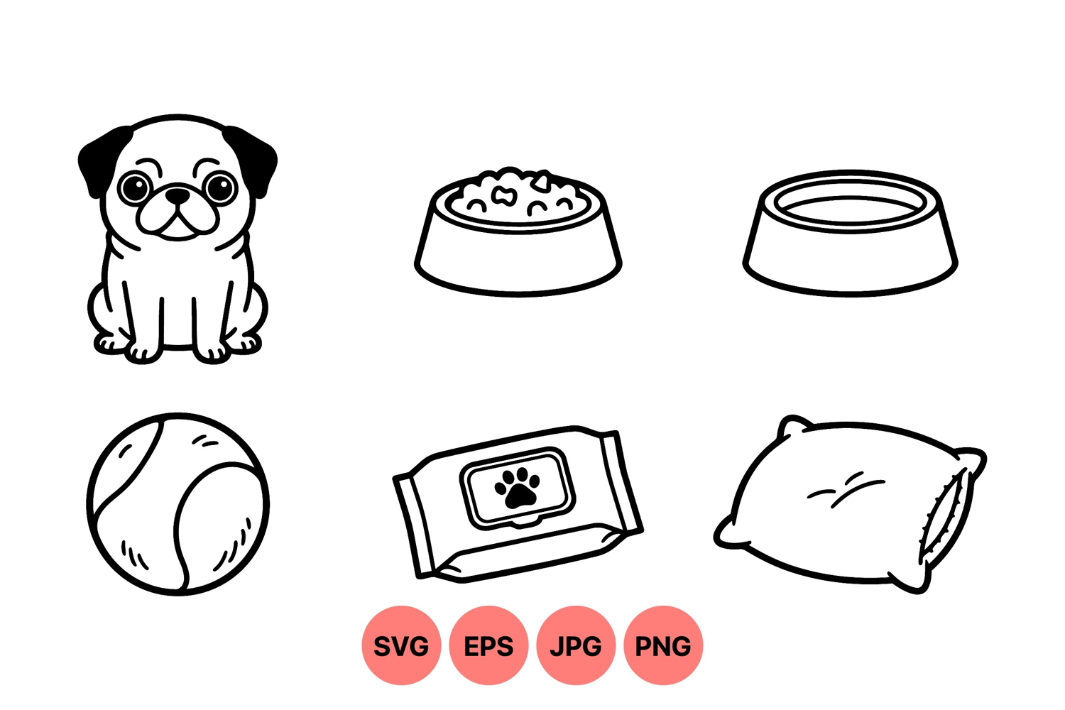 Black and white vector art depicts a sitting pug dog alongside pet accessories including food and water bowls tennis ball wipes and pillow in simple line style friendly appearance