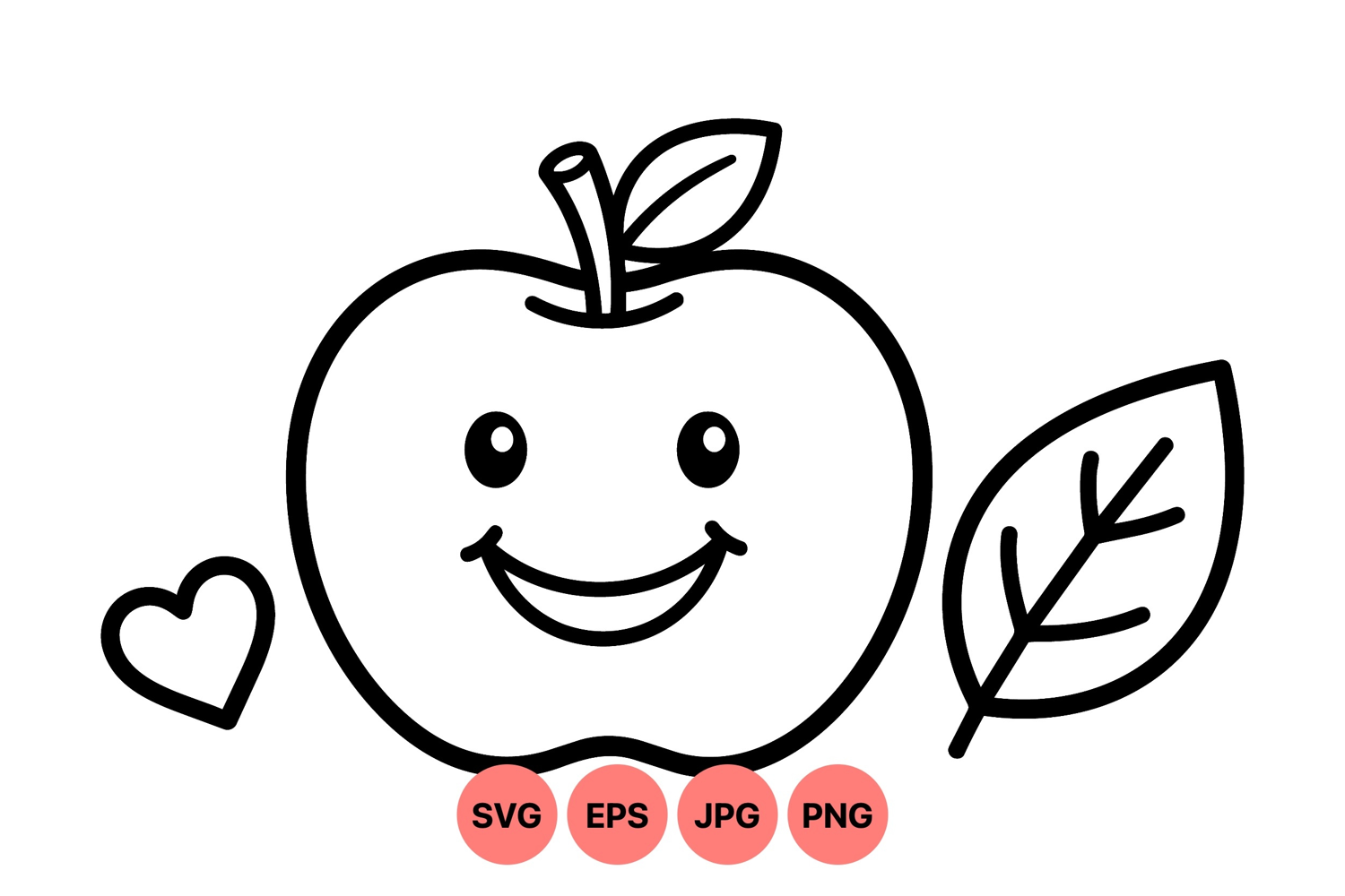 A playful smiling apple character outlined with simple black lines accompanied by a heart and leaf in a minimal hand drawn style suitable for fun educational materials and children designs