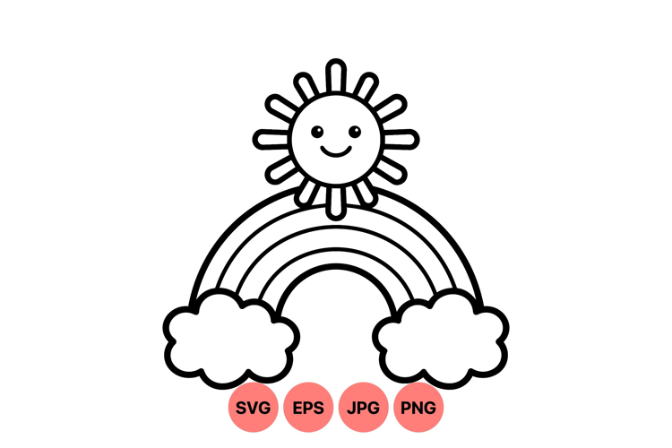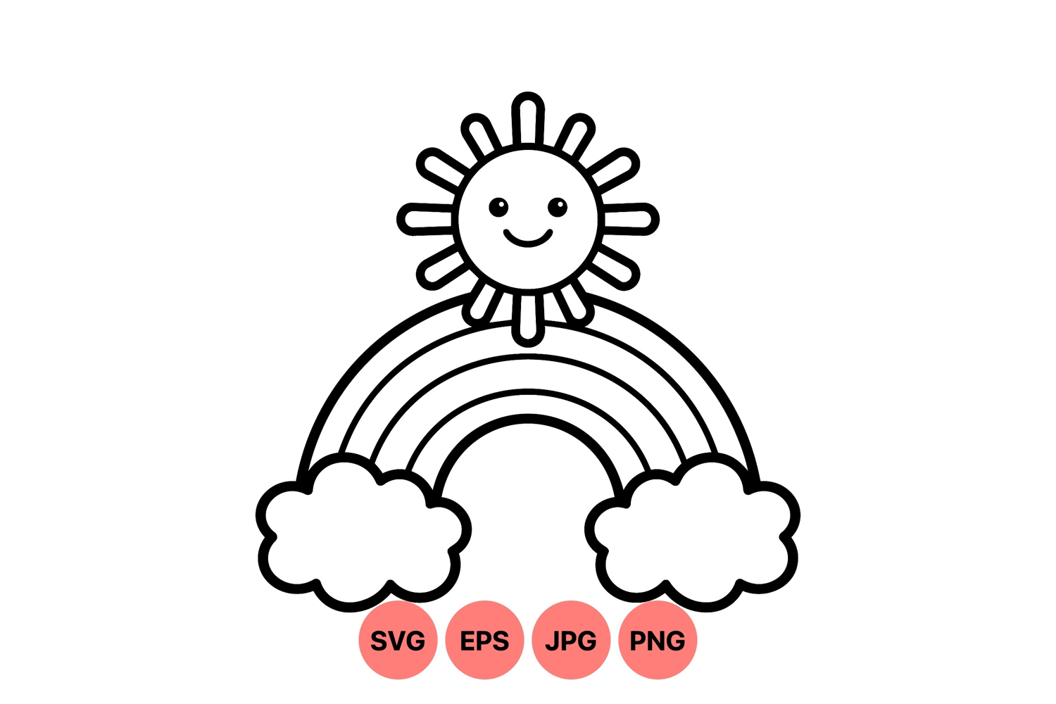 Rainbow With Clouds Happy Sun Clipart Smiling Sun Design Playful Kids Art Cute Weather Icon Lineart Sun Rainbow Childrens Svg Illustration Simple Svg Outline Editable Vector Graphic Monochrome Clipart Design