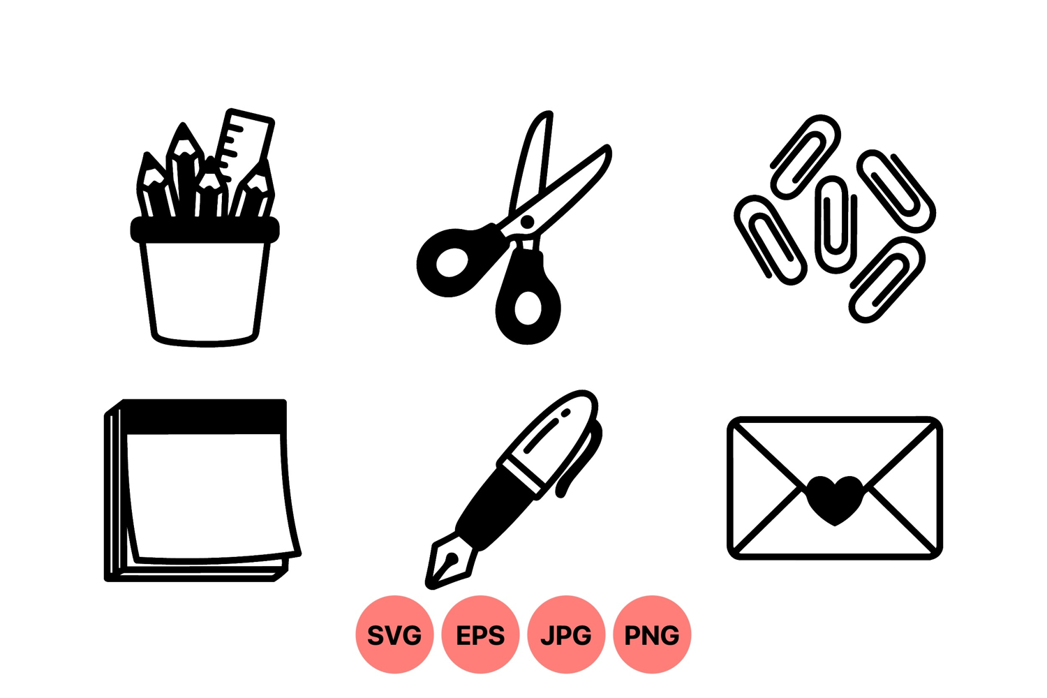 Black silhouette stationery icons feature scissors pen pencil cup envelope with heart sticky notes and paperclips designed in clean flat vector style suitable for web and print uses.