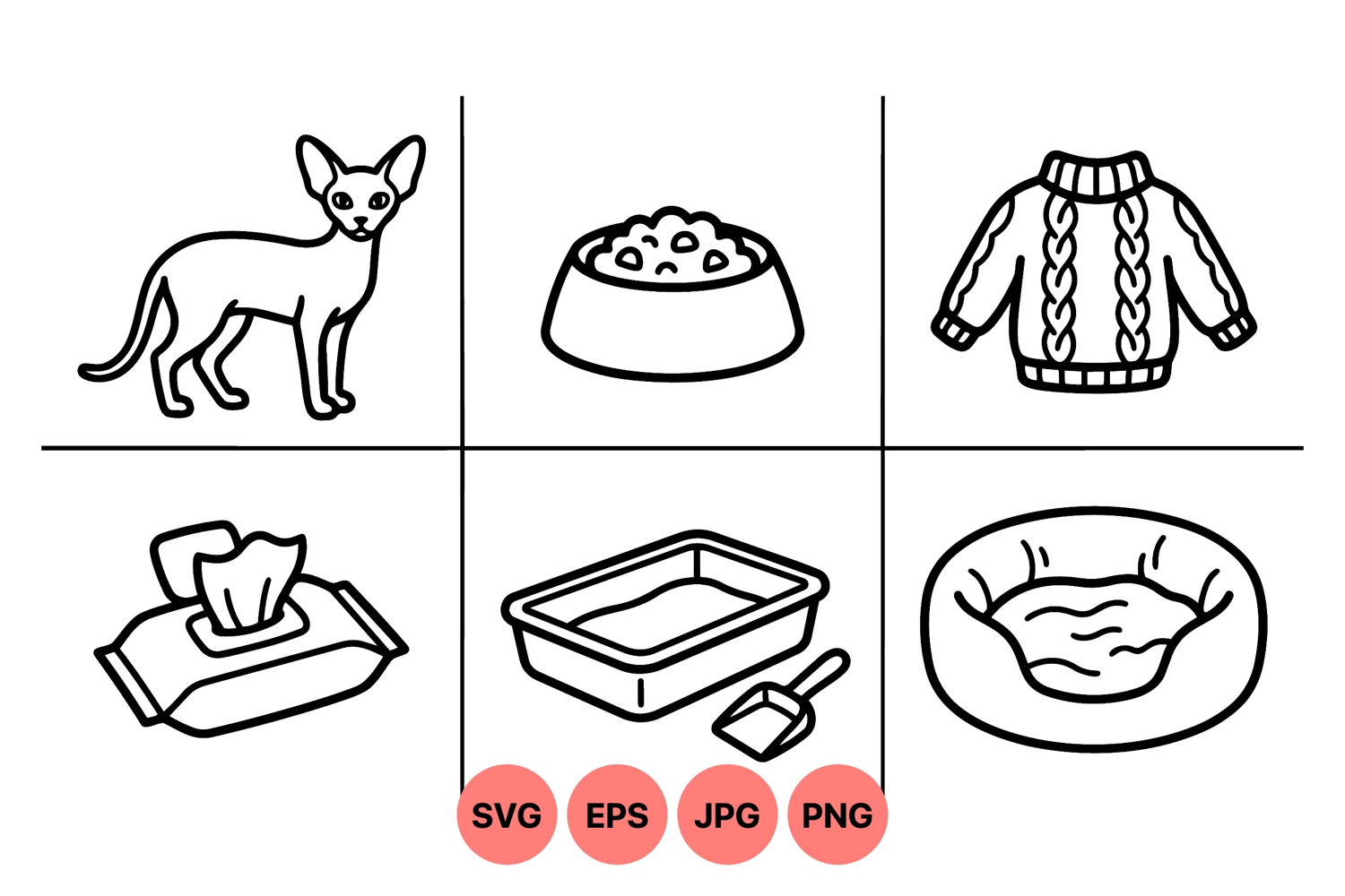 Simple minimalist vector with pet care icons including a cat figure, food bowl, cozy sweater, wet wipes, litter box with scoop, and cushioned bed in black line style.