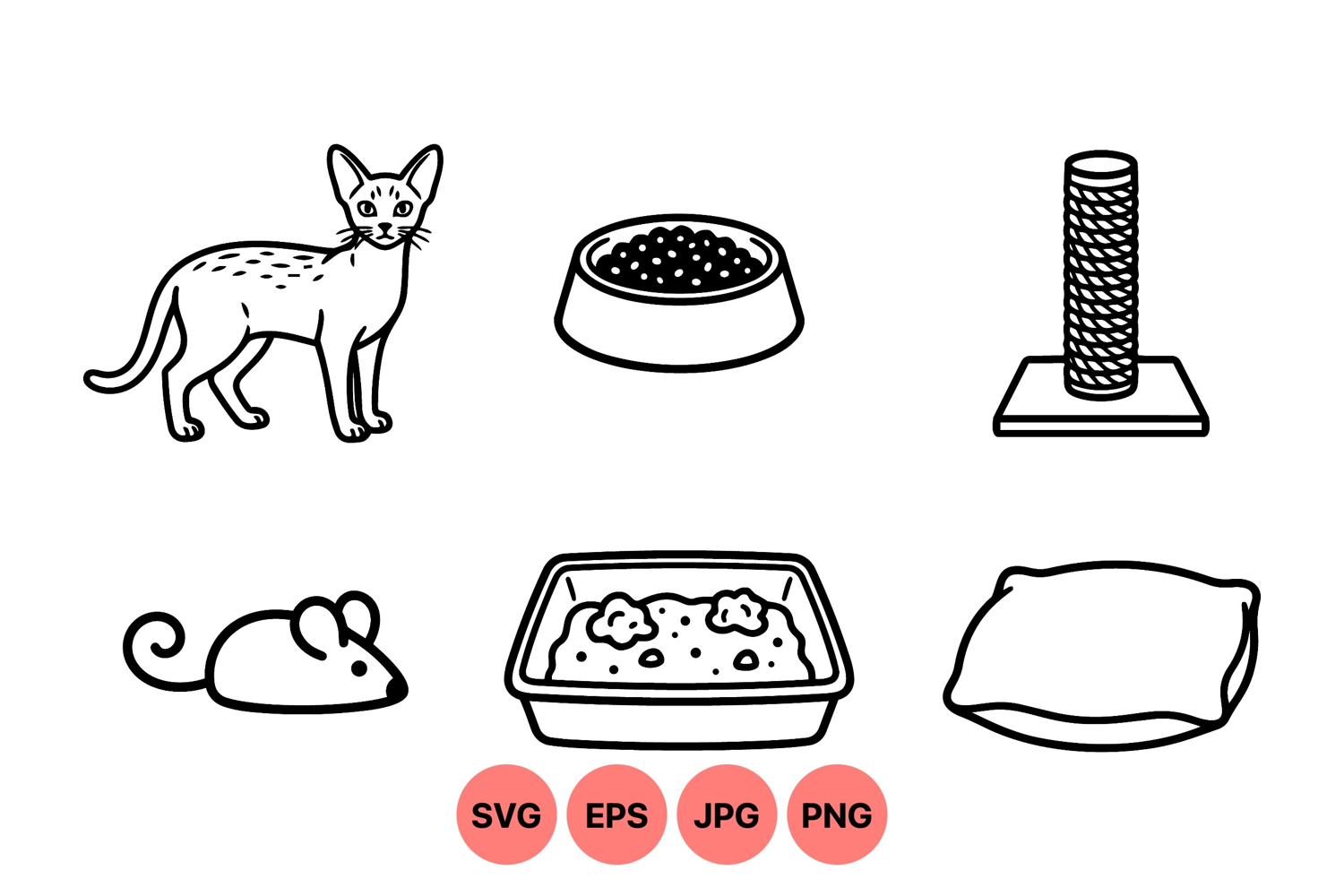 Line Art Illustration Cat Food Clipart Pet Supplies Graphics Animal Care Graphics Scratching Post Design Cat Care Icons Cat Toy Vector Litter Box Drawing Pet Bed Art Kitten Outline Design