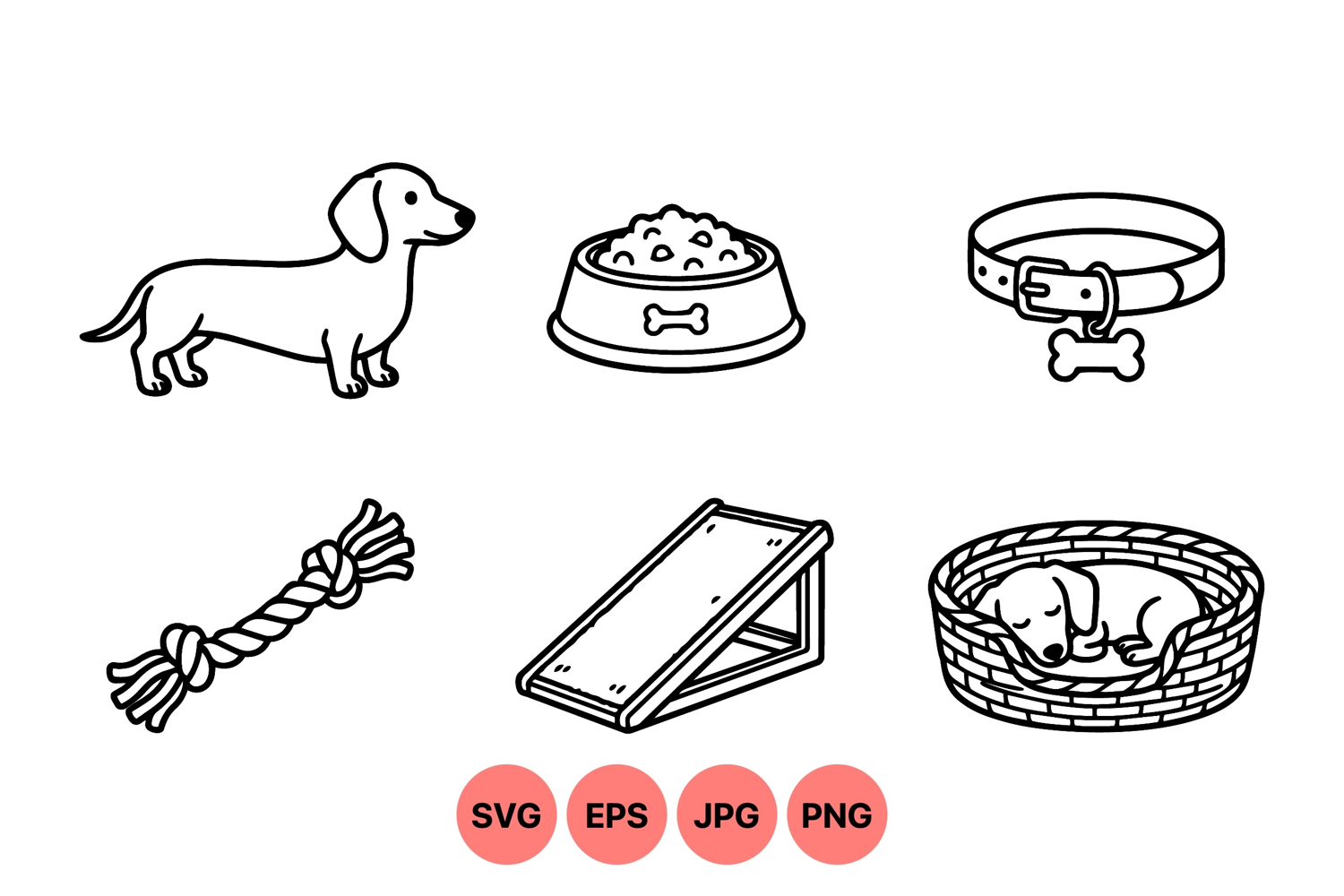 Pet Supply Clipart Dachshund Dog Illustration Dog Collar Design Playful Pet Illustration Dog Bed Drawing Puppy Sleeping Art Dog Food Vector Dog Accessory Art Rope Toy Graphic Outline Dog Svg