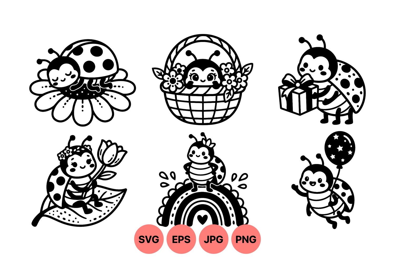 A charming black and white vector featuring ladybugs sleeping on a flower, sitting in a basket, holding a gift, flower, balloon, and standing on a rainbow in playful poses.