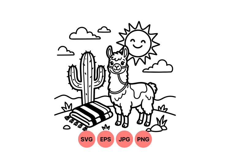 A cheerful llama is depicted in black and white line art style next to a striped blanket and cactus with a smiling sun and clouds above creating a joyful desert scene.